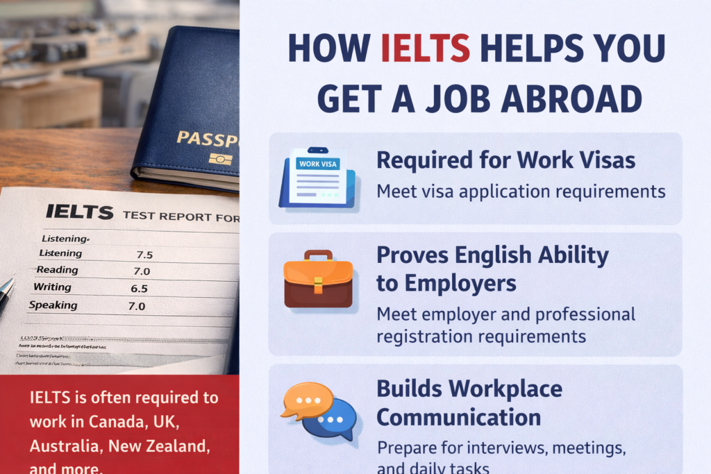 Learn how IELTS helps you get a job abroad by meeting visa requirements, impressing employers, and building real workplace English skills in this practical guide for international job seekers. Working abroad is a goal for millions of professionals worldwide. Higher salaries, international exposure, better living standards, and long-term career growth make overseas employment highly attractive.